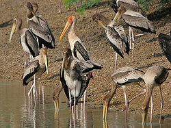 | Mycteria leucocephala | Painted stork | south of the Himalayan ranges and are bounded on the west by the Indus River system where they are rare and extend eastwards into Southeast Asia | |