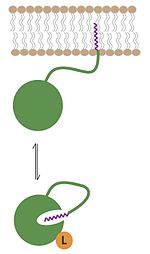 Myristoyl-conformational switches can come in several forms. Ligand binding to a myristoylated protein with its myristoyl group sequestered can cause a conformational change in the protein, resulting in exposure of the myristoyl group. Similarly, some myristoylated proteins are activated not by a designated ligand, but by the exchange of GDP for GTP by guanine nucleotide exchange factors in the cell. Once GTP is bound to the myristoylated protein, it becomes activated, exposing the myristoyl group. These conformational switches can be utilized as a signal for cellular localization, membrane-protein, and protein–protein interactions.[5][12][13]