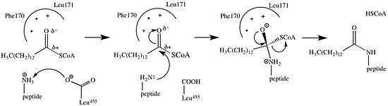 The addition of the myristoyl group proceeds via a nucleophilic addition-elimination reaction. First, myristoyl coenzyme A (CoA) is positioned in its binding pocket of NMT so that the carbonyl faces two amino acid residues, phenylalanine 170 and leucine 171.[9] This polarizes the carbonyl so that there is a net positive charge on the carbon, making it susceptible to nucleophilic attack by the glycine residue of the protein to be modified. When myristoyl CoA binds, NMT reorients to allow binding of the peptide. The C-terminus of NMT then acts as a general base to deprotonate the NH3+, activating the amino group to attack at the carbonyl group of myristoyl-CoA. The resulting tetrahedral intermediate is stabilized by the interaction between a positively charged oxyanion hole and the negatively charged alkoxide anion. Free CoA is then released, causing a conformational change in the enzyme that allows the release of the myristoylated peptide.[2]