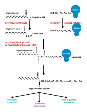 - ^ a b c d e f g h Farazi, T. A. (29 August 2001). "The Biology and Enzymology of Protein N-Myristoylation". Journal of Biological Chemistry. 276 (43): 39501–39504. doi:10.1074/jbc.R100042200. PMID 11527981.
