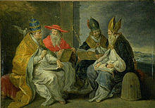 He is celebrated not only as a contemplative but also as a theologian and Father of the Church, a title given to him in a document of the Fifth Ecumenical Council, held in Constantinople in 553, which declared that it followed his teaching on the true faith "in every way".[40] Another document of the same ecumenical council speaks of Augustine as "of most religious memory, who shone forth resplendent among the African bishops".[41]