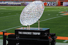 The Bowl Championship Series, famous for its use of math, was the successor of the Coalition and Alliance.[12] Besides the many adjustments it underwent during its tenure, including a large overhaul following the 2004 season that included the replacement of the AP Poll with the Harris poll, the BCS remained a mixture of math and human polls since its inception in 1998, with the goal of matching the best two teams in the nation in a national championship bowl game which rotated yearly between the Sugar, Fiesta, Rose, and Orange Bowls from 1998 to 2005, and later a standalone game titled the BCS National Championship Game (2006 to 2013).[10] The winner of the BCS Championship Game was awarded the national championship of the Coaches Poll thus winning the AFCA National Championship Trophy. The BCS winner also received the MacArthur Bowl from the National Football Foundation.[13] Neither the AP Poll, nor other current selectors, had contractual obligations to select the BCS champion as their national champion.[14] The BCS resulted in a number of controversies, most notably after the 2003 season, when the BCS championship game did not include eventual AP champion USC, the only time the two championships have diverged since the advent of the BCS. After many seasons of controversy, the BCS was replaced with the College Football Playoff, a Plus-One system aimed at reducing the controversy involved in which teams get to play in a championship game through use of a tournament.