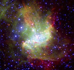 This cluster is located near the center of the brightest H II region in the SMC, designated N66.[7] This is positioned in the northeast section of the galactic bar.[8] Stellar surveys have identified 230 massive OB stars in the direction of this cluster.[4] 33 of the cluster members are O-type stars, with 11 of type O6.5 or earlier.[8] The inner 15 pc radius of the cluster appears centrally condensed, while the area outside that volume is more dispersed.[9] The youngest cluster members near the center have ages of less than two million years,[7] and observations suggests the cluster is still engaged in high mass star formation.[7] The cluster star formation rate is estimated at (4±1)×10−3 M☉ yr–1.[9]