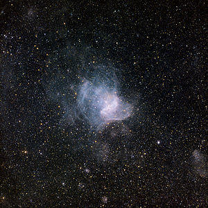 NGC 346 is a young[4] open cluster of stars with associated nebula located in the Small Magellanic Cloud (SMC) that appears in the southern constellation of Tucana. It was discovered August 1, 1826 by Scottish astronomer James Dunlop. J. L. E. Dreyer described it as, "bright, large, very irregular figure, much brighter middle similar to double star, mottled but not resolved".[5] On the outskirts of the cluster is the multiple star system HD 5980,[6] one of the brightest stars in the SMC.
