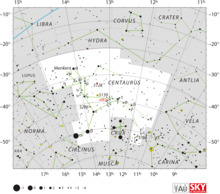 NGC 4945 (also known as Caldwell 83) is a barred spiral galaxy in the constellation Centaurus, visible near the star Xi Centauri.[3] The galaxy was discovered by James Dunlop in 1826 and is thought to be similar to the Milky Way Galaxy, although X-ray observations show that NGC 4945 has an unusual energetic Seyfert 2 nucleus that might house a supermassive black hole.[4] This object has an estimated mass of 1.4+1.4