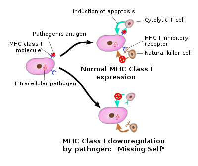 The inhibitory receptors recognize MHC class I alleles, which could explain why NK cells preferentially kill cells that possess low levels of MHC class I molecules. This mode of NK cell target interaction is known as "missing-self recognition", a term coined by Klas Kärre and co-workers in the late 90s. MHC class I molecules are the main mechanism by which cells display viral or tumor antigens to cytotoxic T cells. A common evolutionary adaptation to this is seen in both intracellular microbes and tumors: the chronic down-regulation of MHC I molecules, which makes affected cells invisible to T cells, allowing them to evade T cell-mediated immunity. NK cells apparently evolved as an evolutionary response to this adaptation (the loss of the MHC eliminates CD4/CD8 action, so another immune cell evolved to fulfill the function).[14]