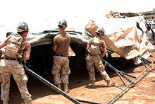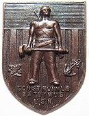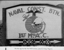 United States Naval Construction Battalions, better known as the Navy Seabees, form the U.S. Naval Construction Force (NCF). The Seabee nickname is a heterograph of the first letters "C B" from the words Construction Battalion.[1] Depending upon context "Seabee" can refer: all enlisted personnel in the USN's occupational field 7 (OF-7), all personnel in the Naval Construction Force (NCF), or Construction Battalion. Seabees serve both in and outside the NCF. During WWII they were plank-holders of both the Naval Combat Demolition Units and the Underwater Demolition Teams (UDTs). The men in the NCF considered these units to be "Seabee".[2] In addition, Seabees served as elements of Cubs, Lions, Acorns and the United States Marine Corps.[3] They also provided the manpower for the top secret CWS Flame Tank Group. Today the Seabees have many special task assignments starting with Camp David and the Naval Support Unit at the Department of State. Seabees serve under both Commanders of the Naval Surface Forces Atlantic/Pacific fleets as well as on many base Public Works and USN diving commands.