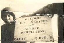 By V-J day 34 teams had been formed. Teams 1–21 saw actual deployment with the Seabees providing over half of the men in those teams. The Navy did not publicize the existence of the UDTs until post-war and when they did they gave credit to Lt. Cmdr. Kauffman and the Seabees.[126] During WWII the Navy did not have a rating for the UDTs nor did they have an insignia. Those men with the CB rating on their uniforms considered themselves Seabees that were doing underwater demolition. They did not call themselves "UDTs" or "Frogmen", but rather "Demolitioneers"[127] reflecting where LtCdr Kauffman had recruited them from, the CB dynamiting and demolition school.