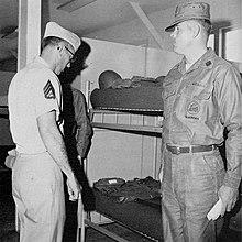 When the war ended the Seabees had a unique standing with the U.S. Marine Corps.[94] Seabee historian William Bradford Huie wrote "that the two have a camaraderie unknown else-wheres in the U.S. military".[95] Even though they are "Navy" the Seabees adopted USMC fatigues with a Seabee insignia in place of the EGA. At least 10 CB units incorporated USMC insignia into theirs. Admiral Moreell wrote that the Marines were the best fighting men in the Pacific. Even-so, a leatherneck had to serve 90 days with the Seabees to qualify to as a Junior Seabee.[96]