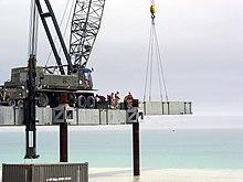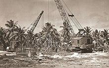 In early 1946 the 53rd NCB was deployed with Operation Crossroads for the nuclear testing at Bikini Atoll.[133] The unit was assigned to Task Group 1.8 and designated TU 1.8.6.[134] 53's project list included observation, instrument and communication towers, radio beacons, seismic huts, photo reference crosses, general base and recreational facilities, as well as dredging the lagoon. The Battalion also assisted the relocation of the natives. The Seabees disassembled the Community center and church for reassembly on Rongerik Atoll. From March–May the battalion numbered 1006 men. From then until 3 August the numbers were drawn down. August 3rd the battalion was decommissioned with the remaining men transferred to CBD 1156 commissioned there then.[135] The TU 1.8.6 designation continued with them. The CBD remained at the atoll for nine days after the second nuclear test.[136][137]