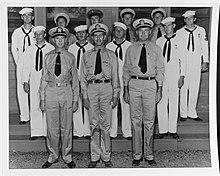 The first team commanders were Cmdr. E.D. Brewster (CEC) UDT 1 and Lt. Crist (CEC) UDT 2. Both Teams were "provisional" totaling the 180 men Lt Crist had put together from the 7th NCR.[119][112]They wore fatigues, life-vests and were expected to stay in boats like the NCDUs. At Kwajalein Fort Pierce protocol was changed. Adm.Turner ordered daylight recon, and Ensign Lewis F. Luehrs, Charp. Bill Acheson and the men with them wore swim trunks under their fatigues.[105] They stripped down, spent 45 minutes in the water in broad daylight. Still wet and in their trunks they reported directly to Adm. Turner. He concluded what they had done was the only way to get accurate intel on submerged obstacles, reporting as much to Adm. Nimitz.[120] At Engebi Cmdr. Brewster was wounded.[105] The success of UDT-1 not following Fort Pierce protocol rewrote the UDT mission model and training regimen.[121] Ens. Luehrs and Charp. Acheson were each awarded a Silver Star for their initiative.[122] while unintentionally creating the UDT "naked warrior" image. Diving masks were uncommon in 1944 and some had tried using goggles at Kwajalein.[123] They were a rare item in Hawaii so Lt. Crist and CB Chief Howard Roeder had requested supply get them.[123] A fortuitous observation by one of the men spotted a magazine advertisement for diving masks. A priority dispatch was made to the States that appropriated the store's entire stock.[123] The UDTs adopted google's independent of the OSS. When UDTs 1 and 2 returned to Hawaii Chief Acheson and three other UDT Officers were transferred to the 301st dredging CB.[112] The 301st had 12 dredges saving Teams from blasting channels, but needed divers to get the job done. Ensign Leuhrs made Lt. and was a member of UDT 3 until he was made XO of team 18. Commander Brewster's purple heart got him out of the UDTs and elevated to Commander 7th NCR instead of back to CB 10.