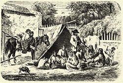 A nomad (Middle French: nomade "people without fixed habitation")[1] is a member of a community without fixed habitation which regularly moves to and from the same areas. Such groups include hunter-gatherers, pastoral nomads (owning livestock), and tinkers or trader nomads.[2][3] In the twentieth century, population of nomadic pastoral tribes slowly decreased, reaching to an estimated 30–40 million nomads in the world as of 1995.[4][5]