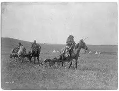 Gros Ventre (Atsina) American Indians moving camps with travois for transporting skin lodges and belongings.