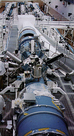 The Novette target chamber (metal sphere with diagnostic devices sticking out), which was reused from the Shiva project and two newly built laser chains visible in background.