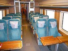 The A-series has a capacity of 207 seated passengers, while the B-series has room for 250. The difference is due to the B-series having a smaller bistro and more compact seating.[1] In the A-series, each of the four cars has seating in a different color (blue in BFM73 car, green in BMU73, red in BFR73, and yellow leather in BM73 and in the bistro area in BFR73). Originally, three of the cars had floors with carpet, while the fourth car (BFM73) had vinyl, of consideration to people with allergies. The carpets were removed in about 2005 as it was difficult to keep them clean. Seating is in two classes, standard and Komfort (originally "Plus"); the latter (BM73 car) with leather seating and power supply for laptops. All the cars have cherry tree wood interior. The trains are equipped with a dining section (BFR73 car) and warm meals can be served at the seat or in the diner. The menu is according to the time of day, with breakfasts in the morning and larger meals in the afternoon and evening. The trains also feature a family section with a play area and HC area (BFM73 car).[2] The BFM73 car has also a bicycle room behind the driver's cab. From 2011, the trains are equipped with free wireless Internet.[4]
