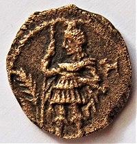 A recent papyrological discovery, the Milan Papyrus, provides further evidence. The relevant part of the Lithika section of the papyrus describes an Arabian cavalry of a certain Nabataean king,[32] providing an early 3rd century BC reference to a Nabataean monarch.[27] The word Nabataean stands alone beside a missing word that start with the letter M; one of the suggested words for filling the gap is the traditional name of Nabataean kings, Malichus.[33] Furthermore, the anonymous Nabataean coins dated by Barkay to the second half of the 3rd century BC, found mainly in Nabataean territory, support such an early date of the Nabataean Kingdom. This is in line with Strabo's account (whose description of Arabia derives ultimately from reports by 3rd century BC Ptolemaic officials) that the Nabataean kingship was old and traditional.[34] In conclusion, Rachel Barkay states that "the Nabataean economy and political regime were in existence by the third century BC".[33] The Kingship of the Nabataeans, was in the view of Strabo, an effective one, where the Nabataean kingdom was "very well governed" and the king was "a man of the people".[35] For more than four centuries the Nabataean kingdom dominated, politically and commercially, a large territory and was arguably the first Arab kingdom in the area.[36]