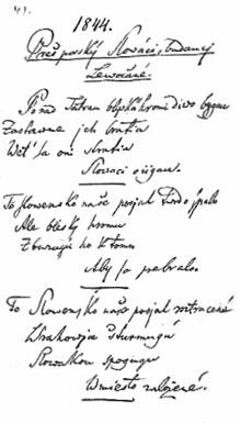 No authorized version of Matúška's lyrics has been preserved and its early records remained without attribution.[8] He stopped publishing after 1849 and later became clerk of the district court.[9] The song became popular during the Slovak Volunteer campaigns of 1848 and 1849.[10] Its text was copied and recopied in hand before it appeared in print in 1851 (unattributed, as Dobrovoľnícka – Volunteer Song),[11] which gave rise to some variation, namely concerning the phrase zastavme ich ("let's stop them")[12] or zastavme sa ("let's stop").[13] A review of the extant copies and related literature inferred that Matúška's original was most likely to have contained "let's stop them." Among other documents, it occurred both in its oldest preserved handwritten record from 1844 and in its first printed version from 1851.[14] The legislated Slovak national anthem uses this version, the other phrase was used before 1993.