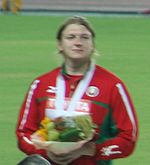 Nadzeya Astapchuk (Belarusian: Надзея Мікалаеўна Астапчук, Nadzeya Mikalayeuna Astapchuk; Russian: Надежда Остапчук, Nadezhda Ostapchuk; born October 28, 1980)[1] is a Belarusian shot putter. She briefly was designated the Olympic Champion in 2012, but was subsequently stripped of the title for failing a drug test and the gold medal was awarded to New Zealand shot putter Valerie Adams.[2] She was World Champion in 2005, but in March 2013, the IAAF reported that her drug test sample from that event had been retested and found to be positive.[3]