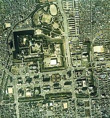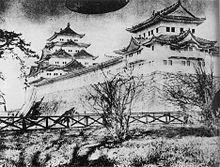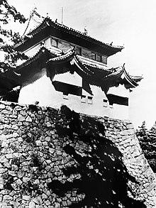 During World War II the castle was used as the Tokai district army headquarters and the administration office of the Nagoya POW camp.[3] The aerial bombardments of Nagoya by the United States Army Air Forces as part of the air raids on Japan brought the most destruction to the castle in its entire history. In January 1945 (Shōwa 20), the Sarumen Tea House was destroyed in air raids. On May 14, the main keep, small keep, golden shachi, Honmaru Palace, northeast turret, and other buildings were completely destroyed in air raids. In June of that year, some of the paintings saved from Honmaru Palace were moved for safekeeping to the Haiho Shrine, Toyota-shi. They returned in May 1946 (Shōwa 21).