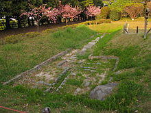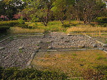 During the early Meiji era, an army barracks was set up in the eastern garden. Mt. Gongen was leveled and the pond was filled in. In 1975, part of the garden was excavated using old drawings as a guide. The garden was renovated mainly around four unearthed structures: the North and South Ponds, the site of the Soketsu-tei teahouse, and the so-called North Culvert. The four rebuilt structures form the main features of the 14,000 square metres (150,000 sq ft) garden. Also nearby are flowerbeds of peonies and other flowers.[13] The garden was opened to the public in April 1978 and named the Ninomaru East Garden.