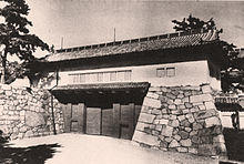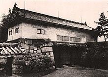 The whole gate structure was built around 1612. The barbican tower was damaged in the earthquake of 1891, and later completely removed. Detailed measurements and architectural drawings were made in the early Shōwa era.[15] The first gate burnt down in the air raid of 1945, leaving only the stone basis and the smaller second gate. Since the second gate is in its original state, it has been designated an Important Cultural Asset.[13]