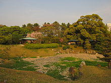 Ninomaru garden and what is presently known as Ninomaru East Garden were once part of the Ninomaru palace grounds and said to have been built between 1615 and 1623, when the Ninomaru palace was constructed. The sanctuary on the north side of the palace was its centrepiece. It was transformed into a Japanese dry landscape garden in 1716.[13] The garden has been remodeled many times, especially between 1818 and 1829/1830. Although its area garden is small, it was designed to represent steep hills, forests, and deep valleys. Many large rocks are within its boundaries. On top of the hill the thickly growing trees offered the lord protection from enemies by providing a hiding place and a secret escape route. These characteristics of the garden have faded over the years, but the basic structure still remains. The garden has been expanded and undergone restorations over the years.[20]