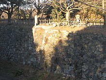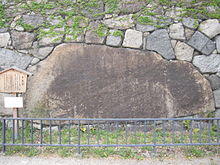 Located at the east gate is a very large stone built into the wall. According to legend, Katō Kiyomasa, a renowned general and castle engineer, hauled this large stone that was later named after him to the castle.[13] But it is probable that this part of the castle's foundation was constructed by Kuroda Nagamasa. Feudal lords who were ordered to build the stone walls carved their marks on their stones to distinguish them from the stones of other lords.