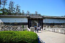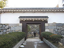 The Nishinomaru Enokida Gate (西之丸 榎多門 Nishinomaru enokidamon) is used today as the main entrance (正門 seimon) to the castle. The original structure was built as a tower gate (yagura mon). A smaller front gate to the south was called Kabuki Gate (冠木門 Kabukimon) and a rectangular-shaped barbican tower was built on top of the surrounding stone walls. Together the structures formed a square called Masugata Koguchi (桝形虎口) where the enemy could be encircled. The gate formed an important part of the castle's defenses, being the main portal into the western Nishinomaru (西之丸) enceinte.