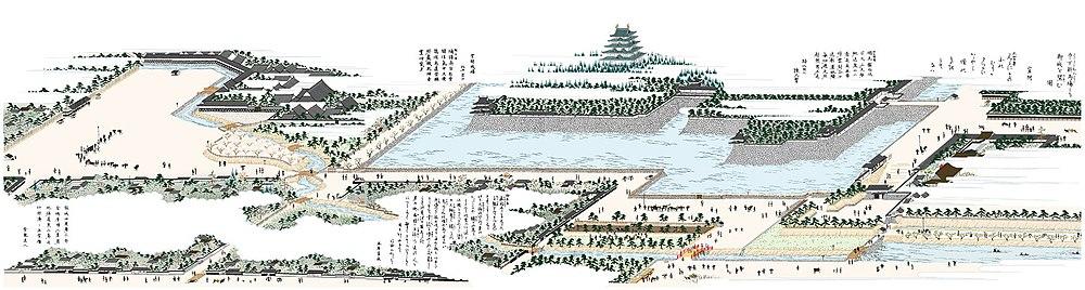 The Ninonomaru existed until the Kaei period (1848–54). Facilities for conducting clan affairs, residences for retainers, gardens, and stables (Mukaiyashiki) were located there. The western two-thirds of the area was known as the Oshiro (the castle), while the eastern one-third was called Ninomaru Goten (the palace). The gardens originally included flowering trees, stone lanterns, and a traditional Japanese-style tea arbour. After the Meiji Restoration, the original was demolished to build army barracks, but it was restored and designated as an official scenic spot after the war.[17]