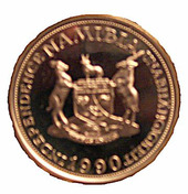 The proof series consisted of four different coins: 1 mark, 1 dollar (both in copper/nickel), 10 marks and 10 dollars (both in silver). The obverse of the mark pieces shows a sitting lion where the dollar pieces depict a San (Bushman) with bow and arrow. All obverse sides bear the indication of denomination as well as the remark ‘PROBE’/‘ESSAI’ (proof). The reverse of the 1-mark/1-dollar pieces shows Namibia's former coat of arms surrounded by the inscription ‘NAMIBIA’, the year (1990) and two ears of corn. The ten-mark/ten-dollar pieces bear the inscription ‘INDEPENDENCE’/‘UNABHÄNGIGKEIT’ (German: ‘independence’) instead of the ears.