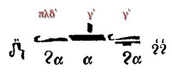 Thus, also conjunct similar tetrachords are constructed by the same intervals in the middle [12+13+3=28]: C νη—D πα is equal to F γα—G δι, D πα—E sharp [βου δίεσις] to G δι—a κε, E sharp [βου δίεσις]—F γα is equal to a κε—b flat [ζω' ὕφεσις−6], etc.
