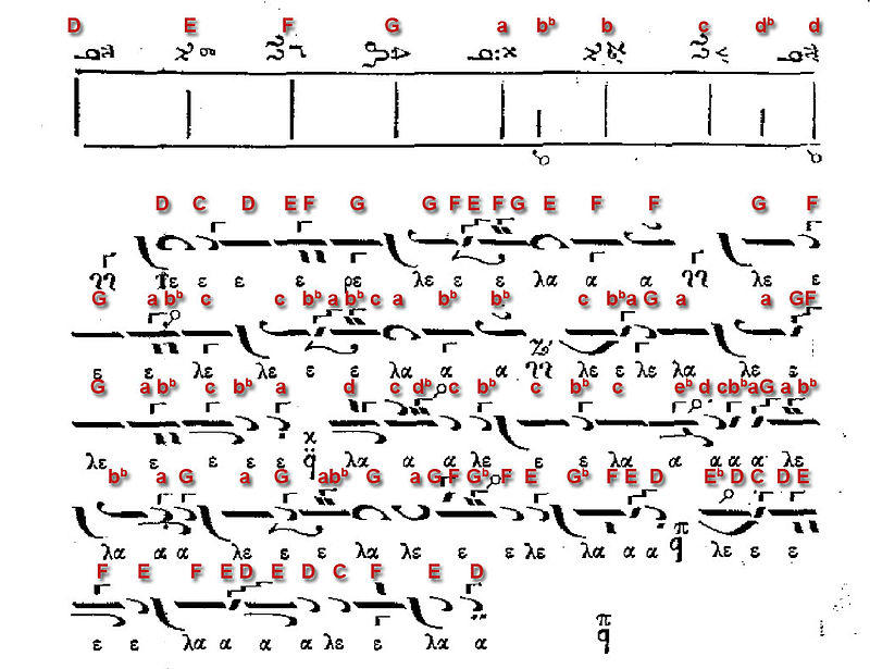 - C νη—D πα—E sharp [βου δίεσις]—F γα, F γα—G δι—a κε—b flat [ζω' ὕφεσις−6], b flat [ζω' ὕφεσις−6]—c νη'—d πα'—e flat [βου' ὕφεσις−6].