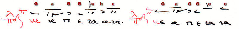 This sticheron could be sung as well by a protopsaltes in the soloistic kalophonic style. If the medial signature of nana was the end of the section chosen for the realisation of a sticheron kalophonikon, this sign could cause, that a whole kratema, a section in abstract syllables like το—το—το for instance, was created in the phthora nana as an echos kratema.[14]