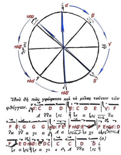 γνωστών σοι δὲ ἔστω καὶ τοῦτο, ὅτι ἡ φθορὰ αὕτη οὐκ ἔχει καθώς ἐστιν ἡ τοῦ πρώτου ἢ τοῦ δευτέρου, ἢ τοῦ τρίτου, ἢ τοῦ τετάρτου, ἤ τοῦ πλαγίου δευτέρου, διότι αἱ τούτων τῶν ἤχων φθοραὶ δεσμοῦσι καὶ λύουσι ταχίον καὶ ποιοῦσιν ἐναλλαγὴν μερικὴν πὸ ἦχον εἰς ἄλλον καὶ ἔχουσι τοῦτο καὶ μόνον.[12]
