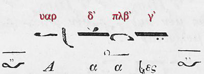 The list of phthora did not include one to indicate a change into the melos of phthora nana. This change was instead caused by one of the great signs (μεγάλα σημαδία), the xeron klasma (ξηρὸν κλάσμα), like here in the sticherarion of the Biblioteca ambrosiana, where the medial signature of phthora nana (a temporary change into its melos) is prepared by this great sign.[13]