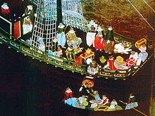 By far the most valuable commodities exchanged in the "nanban trade" were Chinese silks for Japanese silver, which was then traded in China for more silk.[18] Although accurate statistics are lacking, it's been estimated that roughly half of Japan's yearly silver output was exported, most of it through the Portuguese, amounting to about 18 - 20 tons in silver bullion.[19] The English merchant Peter Mundy estimated that Portuguese investment at Canton ascended to 1,500,000 silver taels or 1,000,000 Spanish reales.[20] The Portuguese also exported surplus silk from Macau to Goa and Europe via Manila.[20][21]