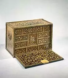 Nonetheless, numerous other items were also transactioned, such as gold, Chinese porcelain, musk, and rhubarb; Arabian horses, Bengal tigers and peacocks; fine Indian scarlet cloths, calico and chintz; European manufactured items such as Flemish clocks and Venetian glass and Portuguese wine and rapiers;[22][16] in return for Japanese copper, lacquer and lacquerware or weapons (as purely exotic items to be displayed in Europe).[23] Japanese lacquerware attracted European aristocrats and missionaries from Europe, and western style chests and church furniture were exported in response to their requests.[24]
