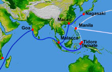 Trade with Japan was initially open to any, but in 1550, the Portuguese Crown monopolized the rights to trade with Japan.[9] Henceforth, once a year a fidalgo was awarded the rights for a single trade venture to Japan with considerable privileges, such as the title of captain-major of the voyage to Japan, with authority over any Portuguese subjects in China or Japan while he was in port, and the right to sell his post, should he lack the necessary funds to undertake the enterprise. He could charter a royal vessel or purchase his own, at about 40,000 xerafins.[10] His ship would set sail from Goa, called at Malacca and China before proceeding to Japan and back.