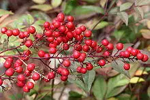 Nandina is considered invasive in North Carolina, Tennessee, Georgia, and Florida.[16] It was placed on the Florida Exotic Pest Plant Council's invasive list as a Category I species, the highest listing. It has been observed in the wild in Florida in Gadsden, Leon, Jackson, Alachua and Citrus counties, in conservation areas, woodlands and floodplains.[17] In general, the purchase or continued cultivation of non-sterile varieties in the southeastern United States is discouraged.