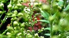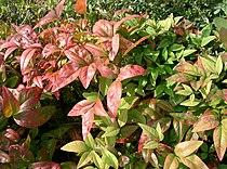 Nandina domestica (/nænˈdiːnə/ nan-DEE-nə)[a][b][c] commonly known as nandina, heavenly bamboo or sacred bamboo, is a species of flowering plant in the family Berberidaceae, native to eastern Asia from the Himalayas to Japan. It is the only member of the monotypic genus Nandina. It is widely grown in gardens as an ornamental plant since it has a number of cultivars that display bright-red fall foliage in the cool months with attractive new foliage growth in spring. Although a popular ornamental shrub, the berries are toxic to birds,[2] especially towards the end of the winter when other food sources become scarce.[3]