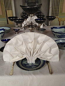 The use of paper napkins is documented in ancient China, where paper was invented in the 2nd century BC.[4] Paper napkins were known as chih pha, folded in squares, and used for the serving of tea. Textual evidence of paper napkins appears in a description of the possessions of the Yu family, from the city of Hangzhou.[5]