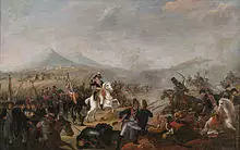 After spending several days looking for each other, the two armies collided at the Battle of Marengo on 14 June. General Melas had a numerical advantage, fielding about 30,000 Austrian soldiers while Napoleon commanded 24,000 French troops.[94] The battle began favourably for the Austrians as their initial attack surprised the French and gradually drove them back. Melas stated that he had won the battle and retired to his headquarters around 3 pm, leaving his subordinates in charge of pursuing the French.[95] The French lines never broke during their tactical retreat. Napoleon constantly rode out among the troops urging them to stand and fight.[96]