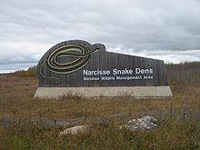 The Narcisse Snake Dens is a provincial wildlife management area located in the Rural Municipality of Armstrong about 6 km (3.7 mi) north of Narcisse, Manitoba. The dens are the winter home of tens of thousands of red-sided garter snakes (Thamnophis sirtalis parietalis). These pits are the largest known concentration in the world of this particular type of snake. Their winter dens are caverns formed by the area's water-worn limestone bedrock. In the spring, they come up from their dens to the snake pits, where they mate, then they disperse into the nearby marshes for the summer.