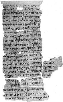 The Nash Papyrus is a collection of four papyrus fragments acquired in Egypt in 1898,[1] inscribed with a Hebrew text which mainly contains the Ten Commandments and the first part of the Shema Yisrael prayer,[2] in a form that differs substantially from the later, canonical Masoretic text and is in parts more similar to the chronologically closer Septuagint. It has been suggested that the text might have been the daily worship of a Jew living in Egypt at the time.[3] The fragments comprise a single sheet and are not part of a scroll. The papyrus is of unknown provenance, although it is allegedly from Fayyum.[4] The text was first described by Stanley A. Cook in 1903. Though dated by Cook to the 2nd century CE, subsequent reappraisals have pushed the date of the fragments back to about 150–100 BCE.[5] The papyrus was by far the oldest Hebrew manuscript fragment known at that time, before the discovery of the Dead Sea Scrolls in 1947.[6]
