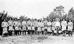 Peach farming sustained Nashville during the Depression. The peach industry came to the Nashville area in the late nineteenth century. Peak years of production lasted from the 1920s until the 1950s. Nashville's peak peach production was 1950, with over 400,000 bushels collected from 425 orchards. "Up to 175 boxcars, each carrying 396 bushel baskets, were shipped from Nashville each day during peak production years."[16] Late freezes and early thaws in 1952 and 1953 led to the devastation of the peach harvests. Two-thirds of the crops were destroyed, and production sank to 150,000 bushels. "The Arkansas growers lost the market, and the impact was devastating. For Howard County growers, the only option was to pull up the trees and convert the land for other purposes, often pasture for cattle, or to raise chickens," which remain the dominant agricultural products in the Nashville area to this day.[16]