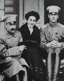 In September 1917, the house arrest was lifted.[75] At the end of the following month the Prime Minister, Alexander Kerensky, was deposed in the October Revolution and the Bolsheviks seized power. With a permit to travel issued by Peter Polotsov, a former army colleague of Michael's who held a command in Saint Petersburg, the family planned to move to the greater safety of Finland.[76] Valuables were packed and the children were moved to an estate south of Gatchina owned by Vladimir Dmitrievich Nabokov, the brother of one of Natalia's closest friends (Nadine Vonlyarlarskaya) and the father of the famous writer, Vladimir Vladimirovich Nabokov. The Bolsheviks discovered their plan, however, and their escape was blocked.[77] The children returned to Gatchina, and they were once again under house arrest.[78] Natalia managed to gain access to her safety deposit box, by claiming that she needed to examine some papers at the bank, and thus retrieved as much of her jewellery as she could conceal without arousing suspicion.[79] The house arrest was lifted in November, but on 7 March 1918 Michael and Nicholas Johnson—who had been his secretary since December 1912[80]—were re-arrested on the orders of Moisei Uritsky, the Head of the Petrograd secret police. They were imprisoned at Bolshevik headquarters in the Smolny Institute.[81]