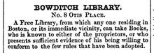 In the 1840s and 1850s, Bowditch's son, Dr. H. I. Bowditch, ran the "Bowditch Library" on Otis Place in Boston's Financial District.[5] It was "free to those who reside in Boston, or in the vicinity. ... This is the library of the late Nathaniel Bowditch, and is almost exclusively of a scientific character."[6] In 1858 the family gave the collection, "which consists mostly of mathematical and astronomical works", to the Boston Public Library.[7]