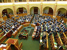 The Diet of Hungary[1] (Hungarian: Országgyűlés) was a legislative institution in the medieval kingdom of Hungary from the 1290s,[2] and in its successor states, Royal Hungary and the Habsburg kingdom of Hungary throughout the Early Modern period. The name of the legislative body was originally "Parlamentum" during the Middle Ages, the "Diet" expression gained mostly in the Early Modern period.[3] It convened at regular intervals with interruptions during the period of 1527 to 1918, and again until 1946.
