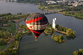 Hot air balloon over Lake Burley Griffin, showing the National Carillon