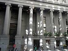 The facade of the original structure featured twelve massive Ionic columns on Wall Street, each a single block of granite from Quincy, Massachusetts.[9][18][19] These columns are each 30.67 feet (9.35 m) tall and measure 4 feet (1.2 m) in diameter. The second- and third-story facade is recessed behind this colonnade, with rectangular brass-framed window openings. In the center of the second floor is a revolving door and two single doors beneath a brass double transom.[20]